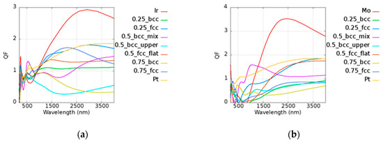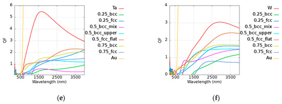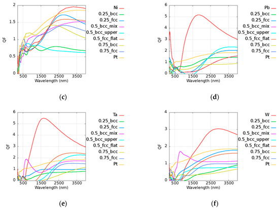 Unlike pure Au, Pt has a smaller Q due to its high imaginary part of the permittivity. The results of Q of Pt-based alloy are shown in Figure 7. In the legend of the plots, the first and the last ones characterize the pure metallic elements. The number represents the atomic ratio of Au, while the text after the number denotes the structure and the morphology under the given atomic ratio condition. For example, in Figure 7a, 0.75_fcc represents Au0.75Ir0.25 with an FCC structure. Pt0.5Ir0.5 (BCC_mix) and Pt0.75Ir0.25 (BCC) had stronger plasmonic responses in the visible range of 600 to 700 nm as compared to pure Pt. Pt0.75Mo0.25 (BCC_mix) exhibited a higher Q in the range of 900 to 1300 nm, which contributes to the lower loss and similar real part of pure Pt. The real and imaginary parts of permittivities of Pt-based alloy are shown in Figure A2 of Appendix A. Pt0.75Ni0.25 (BCC) could be applied in the range of 600 to 1000 nm and Pt0.25Ni0.75 (FCC) had a similar Q to that of two pure metals in the range of 2400 to 2700 nm. Pt0.25Pb0.75 (FCC) and Pt0.5Pb0.5 (BCC_upper) exhibited better results above 2750 nm compared to pure Pt. Pt0.5Ta0.5 (BCC_mix) was good at visible range, and Pt0.5Ta0.5 (BCC_upper) and Pt0.5Ta0.5 (BCC_flat) could be applied above 2700 and 2000 nm, respectively. Pt0.5Ta0.5 (BCC_mix) had a high Q in the broad band of 600 to 1400 nm. Pt was found to be a good candidate for catalysis, as mentioned in the previous discussions. It was shown that some alloys possess better performances than pure Pt. According to our simulation results, the design of the material used in devices may be adjusted in different applications in consideration of the cost and the performance.