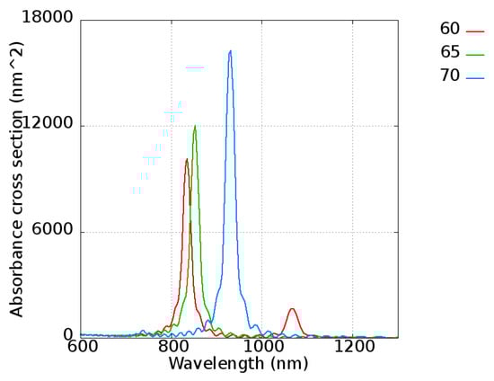 Absorbance cross-sections of the gold nanorods with different nanorod lengths of 60, 65, and 70 nm.