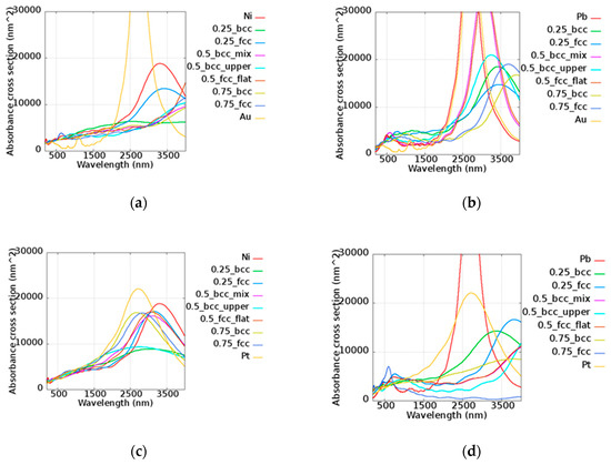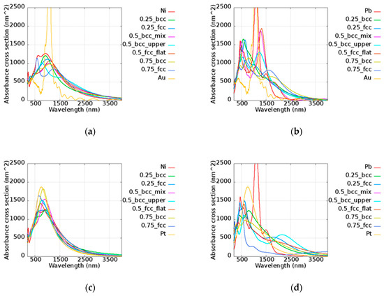 The simulated results of the alloy nanorods with a length of 100 nm and a diameter of 11 nm which have cross-section areas of approximately 1480 nm2 are shown in Figure 9, including AuNi, AuPb, PtNi, and PtPb. Combining the two materials, the trend of the absorbance cross-section was consistent with the Q values. For example, in the AuPb case, the sequence of Q intensity above 1000 nm was Au, Pb, Au0.5Pb0.5 (FCC_flat), and Au0.5Pb0.5(BCC_mix), etc. However, the nanorod peak absorbance was confined to a small region due to the structure effect of the nanorods. The extreme narrow peak of Au is shown, illustrating its high sensitivity. On the other hand, Pt had a strong absorbance in the visible and infrared light regions, Ni showed quite a broad band from 500 to 1300 nm, and Pb possessed two main peaks at around 490 and 1100 nm. The broad band absorbance of Ni and Pb contributed to the additional absorption in the alloy above 2000 nm compared to the pure metal, which may be applied in the lower energy region. In Au-based alloy nanorods, the better plasmonic performance of alloy was demonstrated compared to pure Au in the visible region. The other better performance was shown in the infrared region around 1300 to 1400 nm in all cases compared to Au. It is worth mentioning that the relative narrow bands of Au0.5Pb0.5 (FCC_flat), Au0.5Pb0.5 (FCC_upper), and Au0.5Pb0.5 (BCC_mix) were found and that all peaks were situated in a similar frequency This could reduce the difficulty in synthesis by allowing some ambiguity in stoichiometry. Peak shifting was shown in most cases except for PtIr and PtNi. Due to the analogous electromagnetic response of Pt, Ir, and Ni, the alloys of these metals maintain similar operation wavelengths of 700 to 1100 nm. These alloys can be well designed by tuning their structure parameters for suitable frequency. On the contrary, the wavelength selective absorbance is shown, which may be utilized for different applications in different operation frequency ranges.