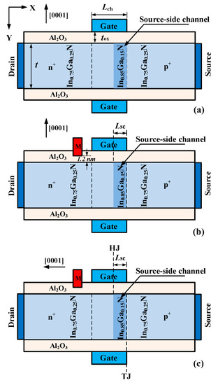 - Duan, X.; Zhang, J.; Wang, S.; Quan, R.; Hao, Y. Effect of graded InGaN drain region and ‘In’ fraction in InGaN channel on performances of InGaN tunnel field-effect transistor. Superlattices Microstruct. 2017, 112, 671–679. [Google Scholar] [CrossRef]