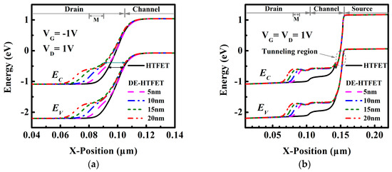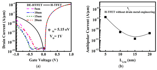 To gain a better insight into the variation of Iambipolar and ION, energy band profiles for VG of −1 V and 1 V are shown in Figure 3a,b, respectively. Figure 3a shows the energy band of DE-HTFET near the drain/channel junction at VG of −1 V. With drain metal engineering, the tunneling distance of DE-HTFET at the negative gate bias is larger than that of HTFET. The tunneling distance of DE-HTFET firstly increases and then decreases with the increase of LGM. DE-HTFET with LGM = 15 nm has the largest tunneling distance in the LGM range from 5 nm to 20 nm. The larger tunneling distance will contribute to a lower electric field (E) and thereby a smaller tunneling rate, as illustrated with Kane’s formula [27]: