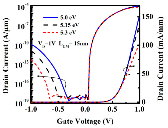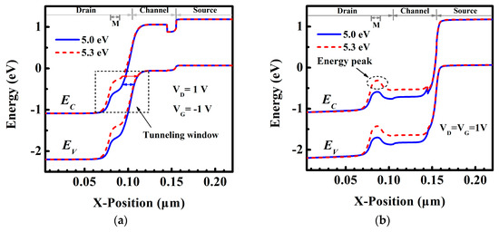 To gain a better insight into the variation of Iambipolar and ION, Figure 5 exhibits the energy band diagram of DE-HTFET with φM = 5.0 eV and 5.3 eV for VG of −1 V and 1 V, respectively. Figure 5a shows that the tunneling distance in the tunneling window for DE-HTFET with φM = 5.3 eV is larger than that for DE-HTFET with φM = 5.0 eV, which results in the lower BTBT tunneling rate at the drain/channel interface for DE-HTFET with higher φM, therefore, lower Iambipolar is obtained for higher φM. Figure 5b shows the energy band profile at the ON-state. An energy peak is created near the drain/channel interface, which will act as a barrier for electrons tunneling from the source to the drain region at the positive bias [28]. Therefore, ION of DE-HTFET with φM = 5.3 eV significantly degrades as shown in Figure 4. To make a trade-off between Iambipolar and ION, φM of 5.15 eV is selected as the last choice.