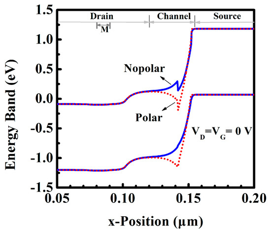 Herein, the polar and non-polar DE-HTFETs are compared. Figure 1c shows the schematic diagram of polar DE-HTFETs. The growth direction is along [0001], that is, the negative direction of X-axis in Figure 1. In this case, the polarization charge at the interface of III-Nitride heterojunction will be taken into account in the simulations. In particular, the polarization charge near the tunneling junction may have important effects on the device characteristics of InGaN DE-HTFET. By calculation, the density of polarization surface charge (σpol) is −1.27134 × 1013/cm2 at the position of TJ, and 1.27134 × 1013/cm2 at the position of HJ. The negative value of σpol represents a negative polarization charge, and vice versa.