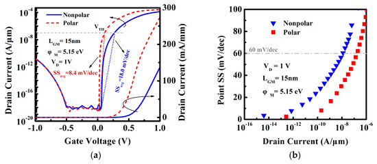(a) Transfer characteristic and (b) point subthreshold swing for the nonpolar and polar InGaN TFET at VD of 1 V.