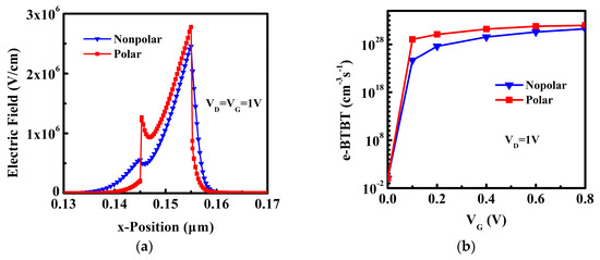 To further investigate the mechanism of performance improvement for polar DE-HTFET, the electric field and e-BTBT rate are discussed as follows. Figure 8a exhibits that the transverse electric field intensity of the channel near the tunneling junction of polar DE-HTFET is higher than that of the non-polar device under the effect of polarization at the ON-state. Therefore, the e-BTBT rate at ON-state between the source and channel of the polar DE-HTFET is much larger than that of the nonpolar DE-HTFET as shown in Figure 7b, which is consistent with Kane’s Formula (1). This is the reason why the polar InGaN DE-HTFETs have the larger ION. On the other hand, the e-BTBT rate with various of VG is shown in Figure 8b. When VG = 0 V, the tunneling rate of both TFETs is almost 0; when VG increases to 0.1 V, the tunneling rate of polar DE-HTFET increases to 1.14 × 1029 cm−3s−1, however the tunneling rate of non-polar DE-HTFET is only 4.49 × 1024 cm−3s−1. The significant increase of the tunneling rate with the increase of VG for polar DE-HTFETs in the subthreshold region makes polar DE-HTFETs have the lower subthreshold swing.