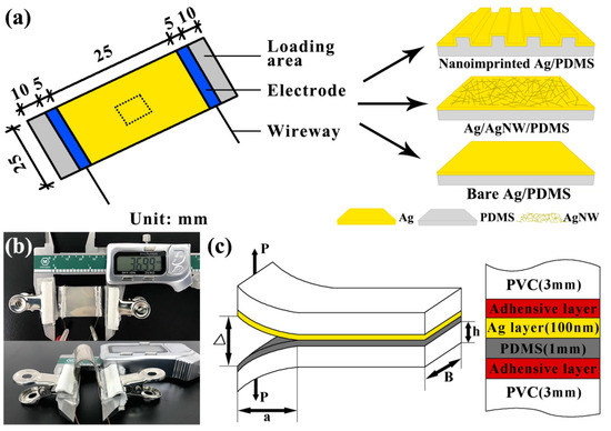The three samples of Ag thin film deposited on bare, Ag nanowires (AgNWs)-treated and nanoimprinted PDMS substrates were used to investigate the performance of composite films. The PDMS (weight ratio of 10:1) was spin-coated on a periodic line array mold (pitch = 200 nm and line width = 100 nm) at a speed of 500 rpm, and reversal imprinted under a pressure of 25 bar at 80 °C for 3 h in vacuum-drying oven through NIL [35,36]. The nanoimprinted PDMS was obtained after demolding from the patterned mold. Similarly, the bare PDMS was fabricated through spin-coating on the bare polycarbonate substrate at a speed of 500 rpm, and cured in a vacuum drying oven. The AgNWs-treated PDMS substrate was prepared by ethanol solution of AgNWs (0.5 mg/mL) coating on bare PDMS through the dip coating method. Then, the Ag thin film (100 nm thickness) was deposited on the patterned, AgNWs-treated and bare PDMS substrates at the same time through vacuum thermal evaporation (Vnano, VZZ-300, Beijing, China). The deposition condition (deposition current = 170 A) and the cooling condition (PDMS substrates were fixed on the cooling plate) were employed for fabricating the samples. The size of fabricated samples is shown in Figure 1a. The right-hand side of Figure 1a shows the enlarged view of the three samples at the dotted line.