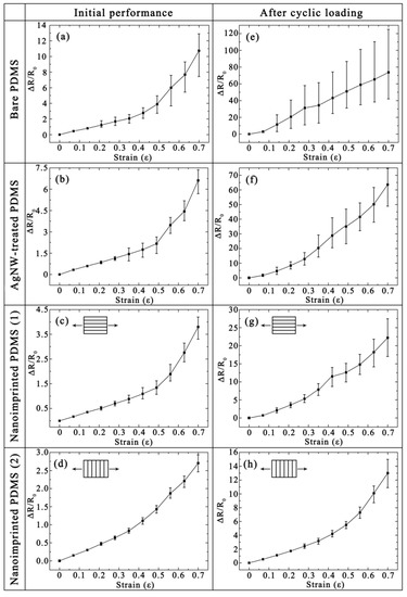 As shown in Figure 3, the tensile properties of Ag thin film on different substrates were evaluated by measuring the ΔR/R0 of metal thin films under initial state and after cyclic loading (1000 cycles with strain of 0.5). To explore the stability and repeatability, the experiments for mechanical properties were explored on six repetitive tests. The values in this figure are the average of six groups of data, and the error lines are the maximum and minimum values of the measured values. The initial sheet resistances (R0) of Ag films on the bare, AgNWs-treated and nanoimprinted PDMS substrates are 9.6, 6.2, and 14.3 Ω under initial state (Figure 3a–d), respectively. The R0 of Ag film on AgNWs-treated PDMS is lowest among the other samples because the AgNWs provided as soft conductive bridges improve the stretchability and conductivity of the Ag film. The R0 of Ag film on nanoimprinted PDMS substrate is highest because the Ag films on the nanoimprinted PDMS surfaces are thinner than other samples due to the vertical deposition of Ag film during the vacuum thermal evaporation process. In addition, the ΔR/R0 of all samples increases with the strain increases. As shown in Figure 3, the Ag film on nanoimprinted PDMS has the smallest ΔR/R0 and error range, and these values of bare PDMS are the largest as the strain increases. This rule is more significant after cyclic loading.