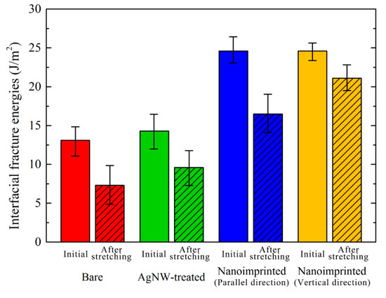 Various Gc for different PDMS substrates show a similar tendency after stretching (strain = 0.5, 1000 cycles) except that their Gc values are lower compared in initial. As shown in Figure 5, their average values of Gc were calculated as 7.3, 9.6, 16.5, and 21.1 J/m2 for the interfaces of Ag/bare PDMS, Ag/AgNWs-treated PDMS, Ag/nanoimprinted (parallel direction) PDMS, and Ag/nanoimprinted (vertical direction) PDMS substrates after stretching (strain = 0.5, 1000 cycles), respectively. All the adhesion energies of the Ag/PDMS interfaces are lower after stretching than initially because the stretching load causes cracks on the surface of the Ag film. After cyclic tensile loading, Ag thin films can be easily deboned from PDMS substrates below the Gc due to the increase of cracks on the Ag film. The Gc reduction ratio of AgNW-treated PDMS is significantly smaller than bare PDMS. This phenomenon is due to the irregular cracks on the surface of bare PDMS, and the fact that the AgNWs have the function of resisting stretching. Similarly to the Gc measured in initial, the interfacial adhesion energies of Ag/nanoimprinted PDMS are higher than the values for the other two samples. The measured Gc values for the stretching load parallel to the pattern is slightly lower than the measured values in the vertical direction. When the nanoimprinted PDMS substrates are stretched, the interface of Ag/PDMS is under both shear and tensile stress. When stretched vertical to the pattern, the metal layer can extend with the stretching of the pattern in PDMS. However, in the case of being stretched parallel to the pattern, the metal layer will crack with the stretched PDMS. Therefore, the measured adhesion energy for the load vertical to the line-pattern is much higher than that for the parallel direction.