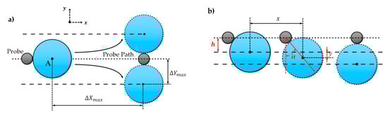 If the microparticle center locates on the push path (the probability is very low), the tip and microparticle will show a maximum displacement and (, Rp and rp are radius of the microparticle and tip horizontal section at the contact point), as shown in Figure 3a. If the microparticle center deviates from the push path by (this probability is high), as shown in Figure 3b, the one-step displacement in the x and y directions will become Δx and Δy ).