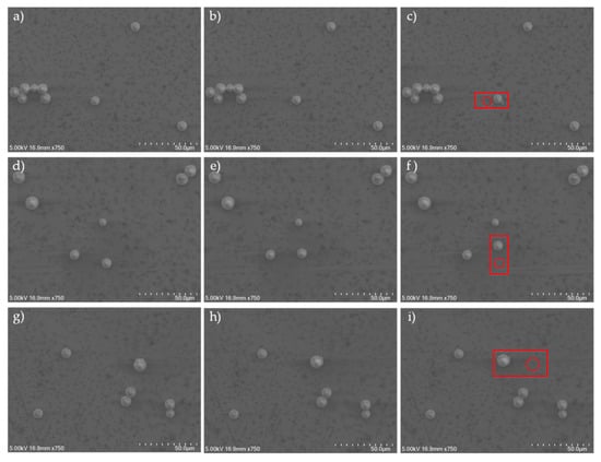 In general, e-beam irradiation increases the adhesion of the microparticle during its movement. Accordingly, it was found that as the operation time increased, the probability of microparticles attaching to the tip increased. However, in cases of limited operation time, by reducing the SEM acceleration voltage and adjusting the interaction angle θ, the adsorption phenomenon could be minimized, and long-distance movement would be achievable. As the interaction between the microparticle and tip was reduced as much as possible, the tip wear was also reduced, and its life span was prolonged.