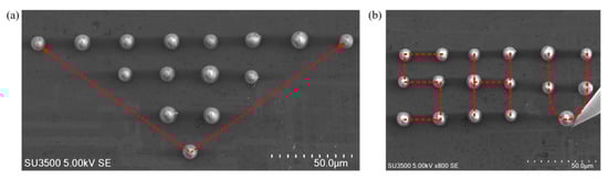 The pick-and-place manner is another manipulation technique, and is good for long-distance movement, whose operation scale is only limited by the manipulator travel limit [,]. Decossas et al. successfully used AFM tips to pick up silicon nanocrystals from a Si surface and move to the target location and release them by a series of pulses []. Cao et al. used the pick-and-place strategy to manipulate microparticles by one nanomanipulator tip inside SEM []. E-beam irradiation was utilized to glue and pick up microparticles, and releasing was accomplished by adjusting the end tilt angle. However, the success rate of the pick-and-place protocol still needs to be improved, as the repeatability of E-beam irradiation pick-up is not very reliable.