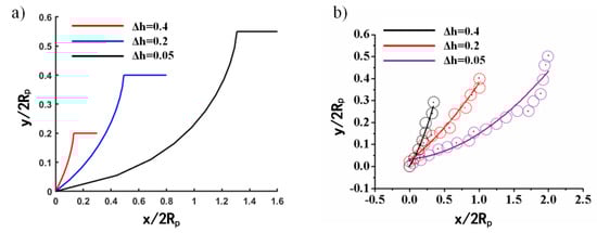 The long-distance is finished by multiple single-step pushes. The tip poses are fixed, as the contact angle, θ, is fixed, and the microparticle trajectory will be dependent on h, according to Equation (4). As the microparticle sizes are variable, an initial relative offset, is defined for normalization. Trajectories of the microparticle center can be drawn by Matlab based on Equation 4, shown in Figure 8a.