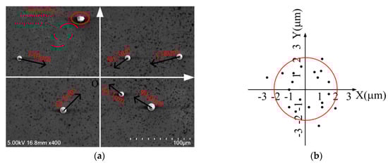 Since the virtual nano-hand strategy divides the long-distance path into multiple short paths, lengths of the whole path do not affect final release accuracy ideally. The final push step before settlement will determine the release precision of microparticles. Twenty sets of experiments were designed and implemented to prove release precision of the proposed strategies. The microparticles were pushed in the range of 100 μm in limited time respectively, and the final release position of each experimental microparticle was recorded, as shown in Figure 9, where final microparticle release positions and their target positions were shown.
