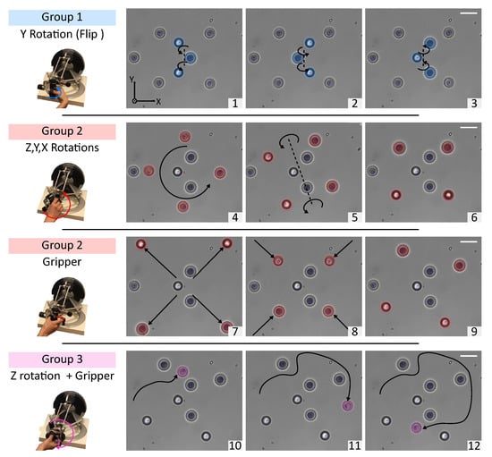 Example of 3D teleoperation using three groups of traps. The operation is a succession of four different tasks demonstrating the system’s capabilities. The first task (1, 2 and 3) is a flip around the y-axis of three micro-beads. The second task (4, 5 and 6) shows the 3D control of four micro-beads. The third task (7, 8 and 9) presents the ‘radial’ operating mode of the gripper. Finally, the last task (Picture 10, 11 and 12) presents the travel of one micro-bead around all the others. Scale bars are 5 long.