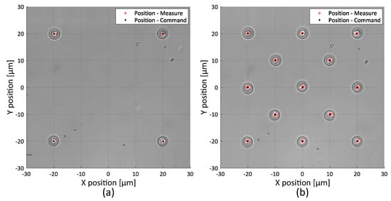 Different static tasks have been performed and recorded during 15 . The static position error value is computed as the maximum error between the trap’s position command and the bead’s tracked position. For a single trap, no differences between the trap’s command position and bead’s measured position are detected, as the stiffness of the trap highly reduced the Brownian fluctuations. We conclude that the error position is less than the resolution of the tracking algorithm, i.e., the position’s maximum error is less than 200 . For four and thirteen micro-beads positioned in a square of 40 × 40 , the position error is calculated as 400 and 1 respectively, and is essentially due to Brownian motion as the effective stiffness of each trap decreases as the number of traps increases. These experimental results for four and thirteen traps are presented in Figure 3.