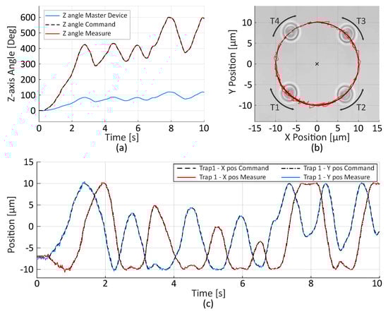 Example of teleoperated rotation in position mode of a group of four micro-beads. (a) The master device orientation and the command sent to the actuators. Z angle is the angle of rotation around the z-axis. The scaling factor is set to 5 in order to allow a complete rotation. The measured angle is estimated from the measured position of Trap T1. (b) The 2D trajectory followed by the Trap T1. (c) The measured position of Trap T1 computed from the video and the set-point. Estimated error is 0.31 with a standard deviation of 0.23 .