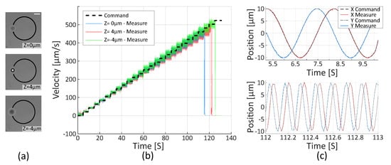 Teleoperated rotation in velocity mode of one micro-bead at different Z positions. (a) Pictures of a trapped bead in three different axial configurations. Scale bar is 5 long. (b) Velocity reference and measured velocity in three different configurations (c) X and Y positions of the Trap 1 in “Z = 0 ” configuration at a speed of 21 and 462 . The maximal reachable velocity without losing the traps is 462 with an error of 4%.