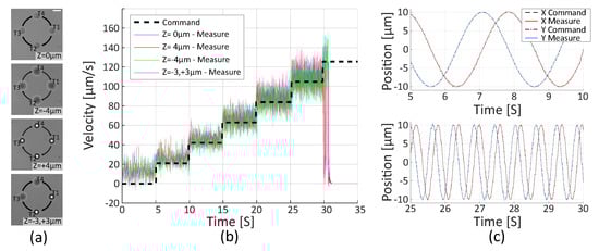 The same experiment performed with a group of four trapped micro-beads with different axial configurations, shown in Figure 6, also demonstrates proper following of the references. The maximal reachable velocity without losing the beads are 105 . Since the beads are lost at the same speed in the different configurations, these experiments validate the proposed velocity control and corroborate that the system produces equally efficient and stable traps, regardless of the traps’ 3D positions.