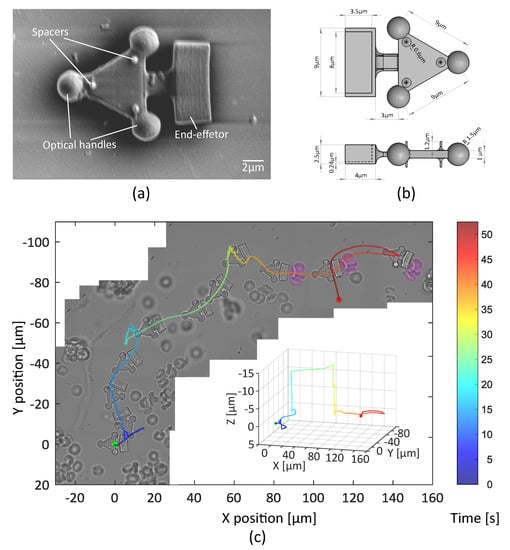 Robot with a shovel-shaped end-effector for cell transport. (a) Scanning electron microscopy (SEM) image of the robot. (b) Schematic depictions with dimensions of the robot. (c) 2D trajectory of the teleoperated robot with an inset of the 3D trajectory. Note that frames between T: 20 and T: 30 show the erythrocytes out-of-focus as the robot is elevated in the Z-direction. Then, a cluster of cells (colored in violet) is transported for 80 . Results also shown in Supplemental Video S3.