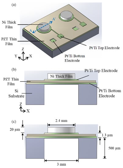 Figure 1a illustrates the magnetic-force-based three-axial MEMS AC magnetic field sensor. The sensor consists of two diaphragm-structured sensing elements: sensing element A and sensing element B. The A-A’ cross-sectional view and dimensions of the sensing element A are shown in Figure 1b,c, respectively. In Figure 1b, the diaphragm-structure consists of a Ni thick film, a Pt/Ti top electrode, a PZT thin film, a Pt/Ti bottom electrode, a SiO2 insulation layer, and a movable Si diaphragm. The silicon diaphragm of two sensing elements was backside-etched to reduce the effect of mechanical clamping (i.e., to enhance the mechanical deformation of the sensor). After the backside etching, the Ni thick films of two sensing elements were magnetized to their different magnetization directions (magnetization direction pointed to +Z-axis and +X-axis for sensing element A and B, respectively) to achieve the three-axial magnetic field sensing function.
