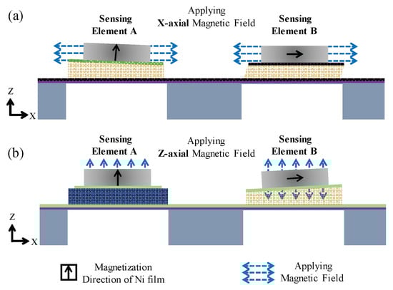 The magnetic field sensing principle when applying (a) X-axial and (b) Z-axial magnetic fields to the sensor, respectively. Note: the magnetization directions of the Ni thick films in sensing element A and B are Z-axial and X-axial, respectively.