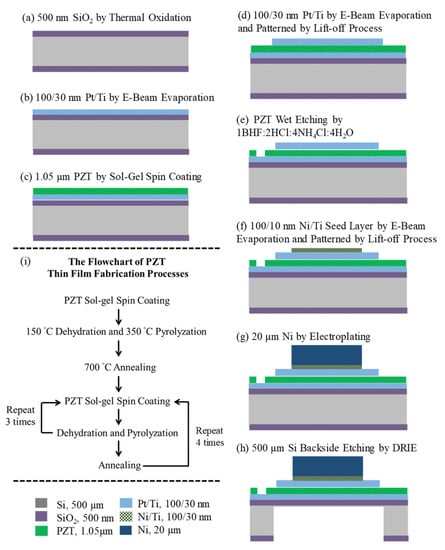 The fabrication processes of the sensor: (a–h) overall fabrication processes. (i) The flowchart of the PZT thin-film deposition.