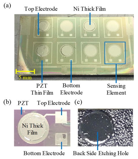 The fabrication processes of the sensor are shown in Figure 3a–h. As shown in Figure 3a–c, the fabrication processes started from a Si-substrate with a thickness of 500 µm. A SiO2 layer with a thickness of 500 nm was deposited by using thermal oxidation on front and back sides of the Si-substrate. After the SiO2 deposition, a Ti adhesive layer with a thickness of 10 nm and a Pt bottom electrode layer with a thickness of 100 nm were deposited on the SiO2 layer by using e-beam evaporation. Following the Pt deposition, a PZT thin film with a thickness of 1.05 µm was deposited on the Pt/Ti/SiO2/Si/ SiO2 substrate by sol–gel spin-coating method [32,33]. The flowchart of the PZT fabrication processes is shown in Figure 3i. In Figure 3i, the PZT sol–gel solution (Mitsubishi Material Cooperation, Tokyo, Japan; Piezoelectric Coefficient: 104 pm/V and 104 pC/N) was spin-coated on the Pt/Ti/SiO2/Si/SiO2 substrate to form a PZT layer with a thickness of 65 nm. After this, the PZT layer was dehydrated on a hot plate at 150 °C for 5 min, pyrolyzed on a hot plate at 350 °C for 5 min, and annealed in a furnace at 700 °C for 4 min. This PZT layer was used as a seed layer to grow the PZT thin film thicker. To accomplish this, the PZT sol–gel spin-coating, dehydrating, and pyrolyzing processes were repeated three times with the same parameters as in the seed layer fabrication. Three PZT layers were annealed in the furnace at 700 °C for 4 min. To make the PZT film thicker, these PZT deposition processes were repeated four times. After the PZT thin film deposition, a Ti adhesive layer with a thickness of 10 nm and a Pt top electrode layer with a thickness of 100 nm were deposited on the PZT thin film by e-beam evaporation and patterned by lift-off process to selectively define the top electrode. After this, the PZT thin film was wet-etched by an aqueous solution of 1BHF:2HCl:4NH4Cl:4H2O to expose the Pt bottom electrode, as shown in Figure 3e. After this, a Ti adhesive layer with a thickness of 10 nm and a Ni ferromagnetic layer with a thickness of 100 nm were selectively deposited on the Pt top electrode by e-beam evaporation, as shown in Figure 3f. This Ni/Ti layer was used as a seed layer for later electroplating. A Ni thick film with a thickness of 20 µm was subsequently electroplated on the patterned Ni seed layer, as shown in Figure 3g. Finally, the backside SiO2 layer was etched by using BOE wet-etching to expose the backside Si-substrate and consequently the Si-substrate was etched by using ICP-RIE dry-etching to form the diaphragm structure, as shown in Figure 3h. After the etching, the PZT thin film was polarized by applying a voltage of 10 V at room temperature for 5 min. After polarizing, the Ni thick films of two sensing elements were magnetized by applying a magnetic field of 1500 Oe for 10 min to have specified magnetization directions (sensing element A: along +Z axis, sensing element B: along +X axis). This completes the fabrication process. The fabricated sensor is shown in Figure 4.
