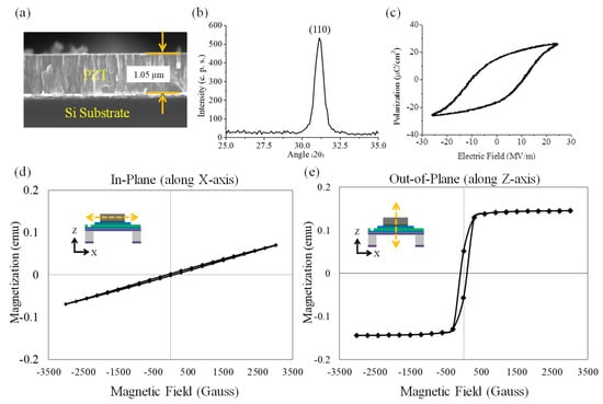 The characterization results of the fabricated Ni-thick-film/PZT-thin-film bi-layered structure: (a) the scanning electron microscopy (SEM) image of the PZT thin film, (b) the X-ray diffraction pattern of the PZT thin film, (c) the ferroelectric hysteresis loop of the PZT thin film, (d) out-of-plane (X-axial), and (e) in-plane (Z-axial) ferromagnetic hysteresis loop of the Ni thick film.