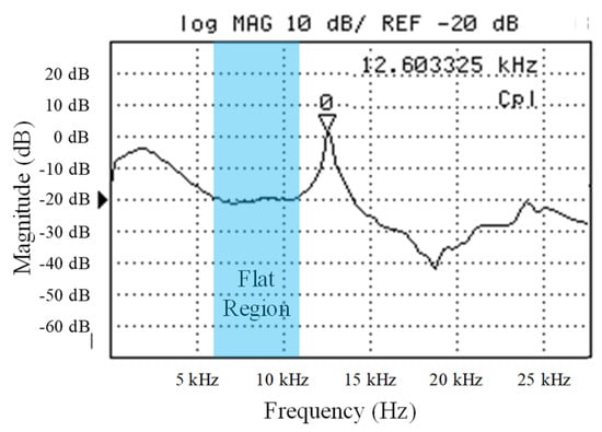 After the characterization, the resonant frequency of the sensor was evaluated by using a laser Doppler vibrometer (LDV). The testing procedures are described as follows. First, we used double-sided tape to attach the fabricated single sensing element onto a miniature piezoelectric actuator, which is a standard testing device used to provide a vibrational frequency sweeping to a MEMS device during the resonant frequency test [28]. After this, the laser spot of the LDV was aligned onto the center of the Ni thick film (which is also the center of the fabricated diaphragm) of the sensing element. After the alignment, a frequency sweep ranging from 1 Hz to 30 kHz was conducted by the miniature piezoelectric actuator. During the frequency sweeping, the frequency response of the sensing element was recorded by the LDV. This completed the resonant frequency test of our sensor. The measurement details of sensor’s frequency response are shown in Section II and Figure S1 of the Supplementary Materials. The results of the frequency response of the sensor were measured and are shown in Figure 6. As shown in Figure 6, the first resonant frequency of the sensor is approximately at 12.6 kHz. Therefore, in order to avoid the frequency-shift-induced sensitivity change of the sensor, the sensor was operated at 7.5 kHz which is in the usable/flat region of the frequency spectrum (i.e., the relative usable/flat region is marked in blue shown in Figure 6). If the sensor was operated at its resonant frequency, small frequency shifts of the magnetic field frequency will cause a significant change of the sensor’s sensitivity which is impractical for general magnetic field sensing applications. Due to this, an AC magnetic field with a frequency of 7.5 kHz was applied to the sensor for testing the performance of the sensor.
