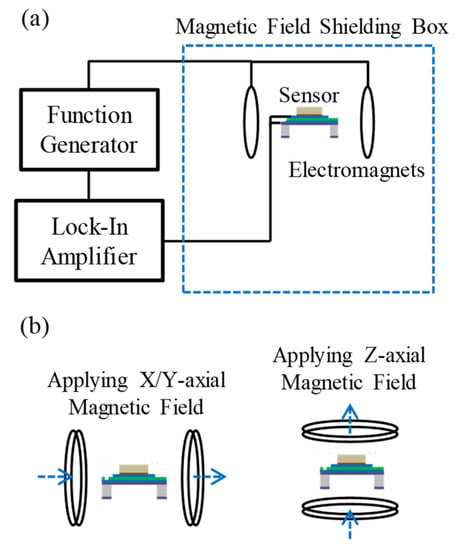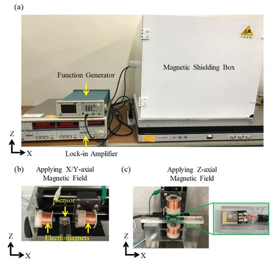 The illustration and photographs of the testing setup are shown in Figure 7 and Figure 8, respectively. The testing setup of AC magnetic field sensing is shown in Figure 7a and Figure 8a. The testing setup consists of a function generator, a lock-in amplifier, a magnetic shielding box, and a pair of electromagnets (inside the shielding box). The illustration and photographs of the configuration of electromagnets for applying three-axial magnetic fields are shown in Figure 7b,c and Figure 8b,c, respectively. The details of magnetic shielding effect of the magnetic field shielding box are shown in Section III, Figures S2 and S3 of the Supplementary Materials. The AC magnetic field sensing procedure is described as follows. First, as shown in Figure 7a and Figure 8a–c, the sensor and electromagnets were placed inside the magnetic shielding box to eliminate electromagnetic noises. A function generator was used to apply an AC voltage with a frequency of 7.5 kHz to the electromagnets to produce an AC magnetic field with a frequency of 7.5 kHz. To measure/calibrate the magnitude of the AC magnetic field produced by the electromagnets, a Gauss meter with an accuracy of 0.1 G at 7.5 kHz and a Gauss meter probe were used. The model of the Gauss meter was Model 5170 (Manufacturer: F. W. Bell, Milwauki, OR, USA), and the frequency bandwidth of the meter was from DC to 20 kHz. The model of Gauss meter’s probe was STD18-0404 (Manufacturer: F. W. Bell, Milwauki, OR, USA), and the frequency response of the probe is from DC to 20 kHz. For magnetic field measurement/calibration, the Gauss meter probe was placed at the center of the electromagnets. After the magnetic field measurement/calibration was completed, the Gauss meter probe was removed, and the MEMS magnetic field sensor was placed at the same location of the electromagnets for further testing. Under the AC magnetic fields, the voltage signals were produced by the sensor and subsequently transmitted through an electromagnetic shielding cable to the lock-in amplifier for signal amplification. After this, the amplified signal was recorded and analyzed.