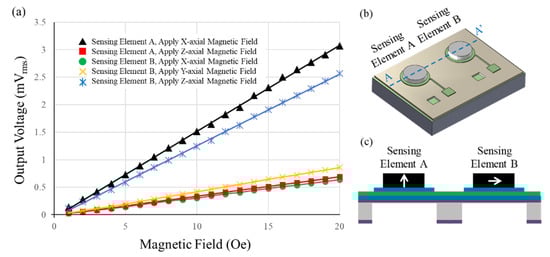 For the testing results, Figure 9a shows the three-axial magnetic fields sensing results of the sensor, Figure 9b shows the isotropic-view illustration of two sensing elements, while Figure 9c shows the AA’ cross-section-view illustration of two sensing elements with different magnetization directions of the Ni thick films. As shown in Figure 9a, the testing results of two sensing elements under three-axial magnetic fields show decent linearity in the testing range of 1–20 Oe. The sensitivities of two sensing elements are shown in Table 2. According to Table 2, when the X-axial magnetic field is applied to the sensor, the sensitivity of the sensing element A and sensing element B is 0.156 mVrms/Oe and 0.033 mVrms/Oe, respectively. When the Y-axial magnetic field is applied to the sensor, the sensitivity of the sensing element A and sensing element B is 0.156 mVrms/Oe and 0.044 mVrms/Oe, respectively. Finally, when the Z-axial magnetic field is applied to the sensor, the sensitivity of the sensing element A and sensing element B is 0.035 mVrms/Oe and 0.130 mVrms/Oe, respectively.
