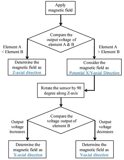 According to the above sensing results, we successfully verified the magnetic field sensing function of three-axial AC magnetic fields. However, the applied magnetic fields were preset in three-axial directions (i.e., the directions of applied magnetic fields were already known). Therefore, to determine the directions of the unknown magnetic field vectors applied to the sensor, we established a criterion based on the above testing results (Figure 9 and Table 2). The criterion is shown in Figure 10. The criterion is based on the comparison of different magnitudes of output voltages produced from two sensing elements when applying an AC magnetic field to the sensor. As shown in Figure 10, when an AC magnetic field is applied to the sensor, the output voltages from two sensing elements are compared. If the output voltage of sensing element A (+Z-axial magnetization direction) is smaller than the output voltage of sensing element B (+X-axial magnetization direction), the direction of the applied magnetic field is determined as Z-axial direction. If the output voltage of sensing element A is larger than that of sensing element B, the direction of the applied magnetic field is temporarily considered as the potential X- or Y-axial direction. To determine the X- or Y-axial direction, the sensor is rotated by 90 degrees along the Z-axis (in-plane rotation). After the rotation, if the output voltage of sensing element B increases (which means the applied magnetic field is orthogonal to the magnetization direction of sensing element B), the direction of the applied magnetic field is formally determined as the X-axial direction. Oppositely, if the output voltage of sensing element B decreases (which means the applied magnetic field is parallel to the magnetization-direction of sensing element B), then the direction of the applied magnetic field is formally determined as Y-axial. Thus, through this criterion, the direction of any unknown magnetic field vector applied to the sensor can be obtained.