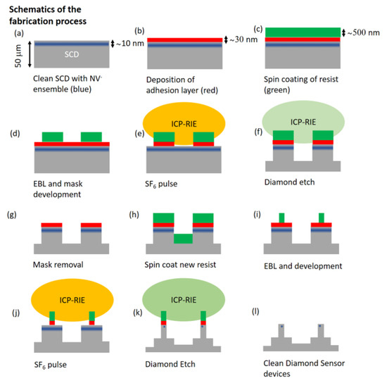In this manuscript, we present a method to overcome two previously not satisfactorily addressed challenges in SCD nanofabrication, namely sample charging as well as non-optimal resist adhesion. We used the optimized process to fabricate SCD scanning probes, namely nanopillars on thin holding platforms [6,16]. We thus reliably fabricated SCD nanostructures easing, e.g., commercial fabrication of SCD scanning probes. Figure 1 depicts the steps of our nanofabrication process. We start with a clean SCD sample with a shallow NV layer (details on sample pre-treatment see Section 2) as mandatory for high resolution sensing. We use electron beam evaporation of silicon on SCD to form a de-charging and adhesive layer (Figure 1b, Section 3). This layer will enable highly reliable spin coating of HSQ (Figure 1c) as well as EBL (Figure 1d, Section 3). Subsequently, we remove the silicon adhesion layer selectively using ICP-RIE without damage to the HSQ mask (Figure 1e) and perform ICP-RIE of SCD to form the desired structures (Figure 1f, Section 4). Our method eases manufacturing complex structures, e.g., in our case, nanopillars (diameter 200 nm), on top of SCD platforms (size of the platform ∼ 3 × 20 m): In the first structuring step, we form the platforms (Figure 1f). The silicon adhesion layer survives the subsequent wet-chemical removal of the HSQ mask (Figure 1g) and can be reused for a second round of processing (Figure 1h–l). In this second processing, we form the pillars. We note that, when etching the platforms, the HSQ mask protects NV centers in the whole area of the micrometer-sized platform. During pillar etching, only NVs protected by the pillar mask survive the process and will be used as nanoscale sensors. The method presented here has been filed for a patent (EP19198772.6).