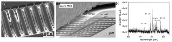 Reliably removing the silicon layer without any residuals is vital to our process: We observed a partial etch stop as well as strong micromasking when applying the O-based plasma without applying the SF6 pulse (see Figure 2a). We deduced a complete and reliable removal of the silicon adhesion layer from two facts: First, in SEM images taken directly after the SF6 pulse (see Figure 2b), a clear contrast between etched and non-etched areas is visible. We also investigated the SF6-based etching process by means of optical emission spectroscopy shown in Figure 2c. In the spectrum a series of emission lines corresponding to fluoride (F) was observed [27]. We attributed the etching of silicon to this F ions. Second, knowing that the O plasma used to etch SCD was not etching the silicon layer, the absence of micromasking and very smooth surfaces in-between the etched structures (see Figure 3a) proved the complete removal of the silicon layer. We note that using pure SF6 is vital to arrive at this result, as introduction of other gases (Argon or Oxygen) at this stage generated severe micromasking. Our SF6 plasma removes the silicon layer while maintaining a 1:20 selectivity in favor of the HSQ mask. For our process, this means that, during removal of the 25 nm thick silicon adhesion layer, less than 2 nm of the HSQ mask, which in our case is several hundreds of nanometer thick, will be lost. This result corresponds well to similar plasmas obtained in different systems showing highly selective silicon etching while conserving SiO (in our case HSQ) [28]. We furthermore observed no or minor etching of SCD during the SF6 pulse and no roughening of the exposed SCD surface. We confirmed full etching of the silicon layer using Raman spectroscopy and XPS, whereas the latter only showed C1s and O1s peaks. Using EDX, we checked that there is no silicon contamination on the etched SCD after the O-based plasma (see Figure 4).