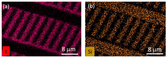 Energy dispersive X-ray (EDX) spectroscopy mapping of SCD cantilevers prepared by the presented method. The EDX mapping has been performed after the SF6 plasma, the O plasma etching the SCD structures (parameters see Table 1) and the wet chemical removal of residual HSQ: (a) carbon signal; and (b) silicon signal. The two maps show complementary images, clearly indicating that, in-between the platforms, we find bare SCD (carbon) with no silicon signal while on the platform, the silicon adhesion layer survived and is ready to be used in the next processing step.