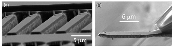 Scanning probe devices manufactured using the described nanofabrication process. (a) Pillars on platforms. The shown devices still need thinning of the SCD plate from the backside to release the devices. (b) Mounted SCD scanning probe. On the right hand side, a quartz capillary is visible that serves as a holder to mount the device to a scanning probe microscope.