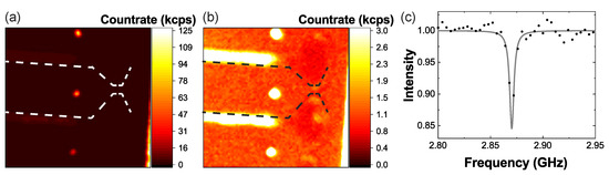 (a,b) PL map of SCD platforms with individual nanopillars fabricated with the process described in Section 4. The outer edge of the holding platform is indicated using a dashed line, while the pillars appear as bright spots. To enable comparing the background PL from the platforms with the PL of a few NV centers in the pillars, we show the same PL map with two different scaling: individual NV centers in the pillars show PL countrates above 125 kcps at an excitation power of 500 W at 532 nm (a). (b) It is clearly discernible that the cantilevers show only a weak PL of ∼ 1 kcps. The enhanced background in-between the platform arises from a slight roughening between the structures. We detect NV PL in the wavelength range >650 nm. (c) An exemplary optically detected magnetic resonance (ODMR) of one of the NV centers in the pillar. The resonance (without an external magnetic field) at 2.87 GHz is clearly visible and has a contrast of ∼15%.