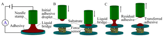 Adhesive micro-bonding mainly refers to joining micro-components with liquid adhesive at approximately the picoliter to nanoliter level. In comparison with welding, thermal bonding, electrostatic bonding etc., it has many advantages including no requirement of high temperature and pressure, simple implementation, and low stress [1,2,3]. Therefore, it is widely used in assembly of microsystems such as micro-gyroscopes, micro-accelerometers etc. [4,5]. Since the bonding strength is generally proportional to the viscosity, a high-viscosity adhesive (>1 Pa·s) is often selected to ensure the joint strength. However, excessive adhesive at the joint will lead to creeping, contamination etc., whereas insufficient adhesive will directly lead to the decline of joint strength [6,7,8]. Obviously, the dispensing resolution is essential for adhesive micro-bonding. Traditionally, the injection has been often used for liquid dispensing [9,10]. However, to obtain the sub-nanoliter liquid, the inner diameter of a hollow needle has to be decreased to a few microns, thus the flow resistance caused by high-viscosity will become very high and the needle is easily blocked too [11]. Therefore, the application of injection is still difficult for the dispensing of high-viscosity adhesive in sub-nanoliter resolution.