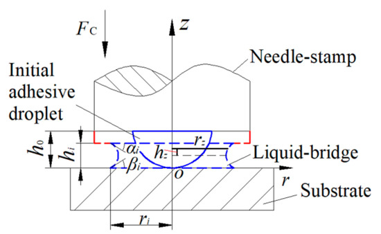 In the dipping-up stage, a needle-stamp is kept at a constant distance from the viscous liquid level and an electric potential is applied between the liquid and the stamp. Thus, driven by Coulomb force, some liquid is stretched up to contact the stamp. Then the stamp is lifted up until the liquid-bridge breaks and thus a droplet is dipped onto the stamp. Here we only used the method to acquire the constant initial volume of droplet. An in-depth explanation of the electrokinetic phenomenon can be found in other references [18,19,20]. In the squeezing stage, the stamp with the initial droplet is positioned above the substrate. Then it slowly moves down to contact and then squeeze the substrate, during which the contact force FC is generated by the squeezing effect on the substrate. Thus the FC is defined as the force of the droplet acting on the substrate and measured with a force sensor. As a result, a liquid-bridge between the stamp and the substrate is formed and then deformed with continuous squeezing. Once the contact force FC reaches a defined threshold (critical contact force FCC), the stretching stage is triggered and the stamp is lifted up until the liquid-bridge is pulled off. Consequently, part of the liquid is transferred to the substrate.