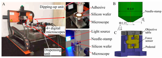 The experimental dispensing device was home-made as shown in Figure 3A, which consisted of three units: dipping-up unit, dispensing unit, and positioning unit. The dipping-up unit mainly included a stainless-steel needle-stamp (Figure 3B), a gold-plated silicon wafer, and some fixtures for the needle-stamp and gold-plated silicon wafer. The dispensing unit mainly included the needle-stamp with the initial adhesive droplet, silicon wafer, and force sensor (resolution 1 mN, LH-S09A-200g, Shanghai Sensing Technology, Shanghai, China). The silicon wafer was placed on the force sensor, shown in Figure 3C. The positioning unit was used to move the stamp in three dimensions. In addition, the adhesive volume V and its contact area Sa–s on the substrate could be measured with a 4× digital microscope. The measured transferred volumes were verified with a confocal laser scanning microscope (CLSM, VK-X200, Keyence, Osaka, Japan), as shown in Figure 4G.