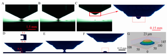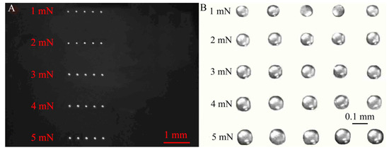 The experimental process is shown in Figure 4A–F: (A) some adhesive was stretched up by Coulomb force under a suitable electric potential; (B) a liquid-bridge between the needle-stamp and the liquid level of adhesive was formed; (C) an adhesive droplet was dipped onto the needle-stamp with the liquid-bridge breakup; (D) the initial adhesive droplet was squeezed under the increasing contact force FC, during which a liquid-bridge was formed and deformed; (E) until FC reached a defined value of 1 mN (FCC), the liquid-bridge was immediately stretched; (F) the liquid-bridge breaks and part of it was kept on the silicon wafer by the adhesive effect. The dispensing process was repeated five times for each defined contact force from 1 to 5 mN, shown in Figure 5.