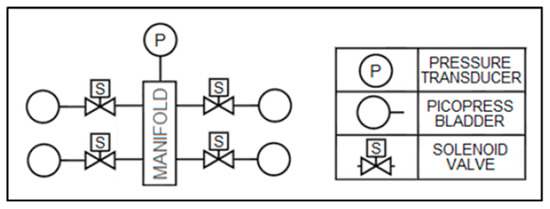 Pneumatic-based sensors are one of the most prevalent designs for measuring compression garment interfacial pressure [9]. These sensors utilize bladders or compartments that are filled with a small volume of air connected to a pressure transducer through a flexible hose [16]. As pressure is applied, the volume of the bladder decreases, thus increasing the internal pressure. At a constant temperature, it is assumed that the internal pressure measured by the transducer is equivalent to the external applied pressure [16]. Commercially available pneumatic sensors, such as the Salzmann MST MKIV [17], MediGroup Kikuhime [18] and Microlab PicoPress [19] are thin and flexible devices that can be used to measure interfacial pressures between the body and compression device. Furthermore, pneumatic pressure transducers have been found to exhibit repeatable results within +/− 3 mmHg of error [8,19]. A major shortfall of this technology is its temperature dependence [8]. Additionally, their high sensitivity to curvature can result in overestimates of pressure by up to 150% [9]. The sampling rate of the system is affected by the tubing length, which can be important in the evaluation of rapid inflation active compression systems. Additionally, pressure sensing with an array of pneumatic sensors presents multiple inconveniences. The sensors each require a dedicated pressure transducer and have a large surface area (a PicoPress sensor is approximately 50 mm in diameter), resulting in poor spatial resolution. These types of sensors need a great amount of tubing and rely on pressure transducers that are bulky and almost 10 times larger in footprint than the actual sensor, [19]. Sensor multiplexing can reduce the number of transducers in a system, which uses solenoid valves to isolate each bladder for pressure reading (see Figure 1). However, the addition of a manifold increases the system volume, lowering the sampling rate and the transducer’s sensitivity to bladder volume change.