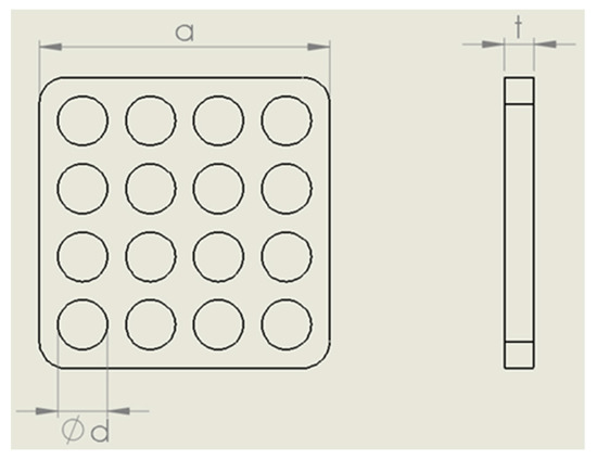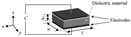 where and are the relative permittivity of the dielectric layer and the vacuum permittivity respectively. Compression of the capacitive sensor along the z-axis, (see Figure 2), causes a decrease in the dielectric layer thickness and the distance between the two electrodes, d. Assuming unconstrained edges and an incompressible material for the dielectric layer, this results in an increase in the area, (), [26]. Both changes result in an increase of the capacitance, which can then be correlated to an applied pressure.