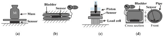 Test configurations for pressure sensor validation. (a) Mass Test, (b) Bladder Test, (c) Piston Test, (d) Curvature Test.