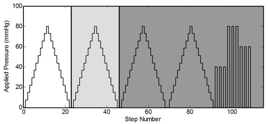 The mass test (Figure 5a) is performed on a flat surface where the sensor sits with masses stacked on top of it. The mass applied increases in 50 g increments from 0 g up to 550 g. The applied pressure to the sensor is determined by measuring the total weight placed on the sensor over the area of the sensor. The sensor is subjected to static loads at increments of approximately 7 mmHg that are held for 30 s at a time, up to a maximum pressure of 80 mmHg. The average and standard deviation of the capacitance for a 10 s period is collected for each increment. The 10 s period is taken after the load has been applied and the measurement reading has settled. The loading profile (shown in Figure 6) has four incremental loading and unloading cycles and nine direct loading and unloading cycles. The incremental cycles are used to measure the hysteresis inherent in the sensor. Meanwhile, the direct loading cycles closely match the use-case for these sensors when applied under, for example, intermittent pneumatic compression devices. The results from the first incremental loading and unloading cycle (white section in Figure 5) are discarded as a “bedding-in” cycle, as recommended by StretchSense, to allow the sensor to acclimate to a stable position. The second incremental loading and unloading cycle (light grey section) is then used to calibrate the sensor. A fit is applied to the calibration data and this curve fit is then used to convert the capacitance measurements of the remaining validation data (dark grey section) to pressure estimates. This test is meant to examine repeatability, linearity and hysteresis of the sensor in static conditions.