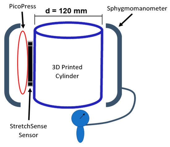 Finally, two additional testing configurations not shown in Figure 5 are employed. First, the effect of temperature and humidity on the no-load capacitance of the sensor was examined. This is done by repeating the mass test at 26 °C and then comparing it to the data from the 29 °C mass test. In addition, the variance in capacitance of the sensor is observed for a range of 17 to 42 °C and 45 to 69 %RH. Second, a curvature test compares the response of the capacitive sensor to that of the PicoPress pneumatic sensor. This test involved a 3D printed cylinder with a radius of 60 mm to serve as a rigid dummy leg (see Figure 7). The two sensors are placed on the cylinder with the StretchSense sensor against the cylinder and the PicoPress directly on top of it. Since the PicoPress sensor is considerably larger in size than the StretchSense sensor, the entirety of the StretchSense sensor contacts the PicoPress bladder. A sphygmomanometer is then wrapped around the cylinder and sensors to apply a known pressure. The pressure in the sphygmomanometer is manually controlled with the hand pump. The test involves a series of 10 inflations and deflations of the sphygmomanometer at three different pressures. The applied pressures are 40 mmHg, 60 mmHg, and 80 mmHg, respectively. During deflation, a minimum pressure of 5 mmHg is kept in the sphygmomanometer to prevent the cuff from moving and/or slipping. In this test, the sensor responses were both compared to the sphygmomanometer pressure and each sensor error were calculated.