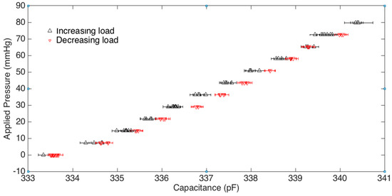 The results of the mass test are shown in Figure 8, where the mean capacitance measurement is plotted along with error bars for each increment. The error bars indicate +/− twice the standard deviation of the measurement at each point, which gives a 95 % confidence that values lie between the bars. The graph is plotted with the capacitance on the x-axis since the interpretation of the sensor would require the reading of the capacitance to determine the pressure applied. The slope of a linear fit through all the data points (loading and unloading) indicates that the sensor sensitivity is 0.0847 pF/mmHg. The average error bar width is +/− 0.12 pF, which corresponds to an average pressure error of +/− 1.4 mmHg when converted using the sensitivity defined above.