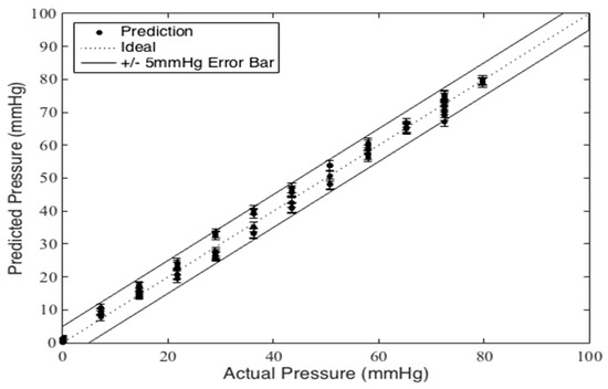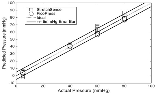 There is a discrepancy between measurements when the masses are being loaded versus unloaded, indicating that there is hysteresis in the system. The hysteresis error is defined as half of the span of the capacitance at a given pressure from loading versus unloading. The data points with increasing load are shown with triangles pointed upwards, while the decreasing loads are shown with triangles pointed downwards. The average hysteresis error across the applied pressures was computed to be +/− 3.0 mmHg. The overall error of the sensor in this test setup is just outside +/− 5.0 mmHg as also shown in Figure 9 which displays the predicted pressures versus the actual pressures using the aforementioned sensitivity calibration. As shown in this figure, the percentage error is significantly smaller for the upper range of pressure.