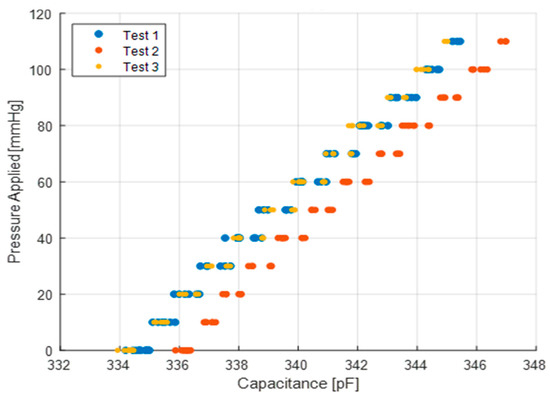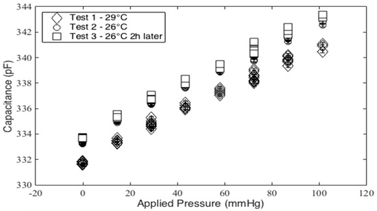 The bladder test described in Section 3 was repeated three times and the results are shown in Figure 10. To ensure repeatability, the setup was disassembled and reassembled after every test. The pressure was applied using a sphygmomanometer of +/− 3 mmHg accuracy. The test results show an offset of 2 pF in one of the tests for all pressure ranges shown, however, it is noteworthy that the sensor sensitivity for the three tests remains the same. The causes for the offset are explored in the coming section that examines the effect of temperature and humidity on the sensor performance. The sensor sensitivity from the bladder test calibration was found to be 0.100 pF/mmHg, which is approximately 18% higher than the results from the mass test. This is likely due to the softer material in contact with the sensor during these tests that allows for larger expansion along the plane of the sensor, thus increasing its deformation. On a hard, rigid surface, the sensor sticks to the surface and the friction restricts deformation. In the case of the mass test, the rigid surface in contact with the sensor ultimately results in a smaller sensitivity for similar pressure values. The average measurement noise is approximately +/− 0.18 pF (+/− 1.8 mmHg).