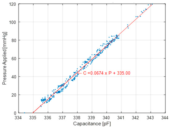 The piston test setup is designed to examine the repeatability of the sensor readings over the course of over 400 loading and unloading cycles. Figure 11 presents the peak values of the load cell pressure readings versus the capacitance of the pressure sensor. The degree of vertical scatter in these data points for a given capacitance represents the repeatability of the sensor measurements, which is considerably smaller at larger pressure values. The hysteresis is not captured during this test since only the maximum load at each cycle is recorded. This results in a smaller overall error of +/− 5.0 mmHg when measuring the vertical scatter in the plot. The best curve fit for Figure 11 corresponds to a sensitivity value of 0.067 pF/mmHg which is on the same order of magnitude as the mass test sensitivity.